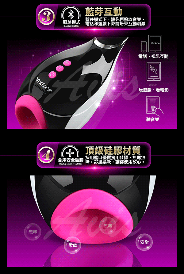 一、飛機杯內發聲裝置可通過藍牙發出手機與電腦內的音樂、視頻聲音,並根據聲音頻率強弱來改變震動的頻率與​​震動強度哦