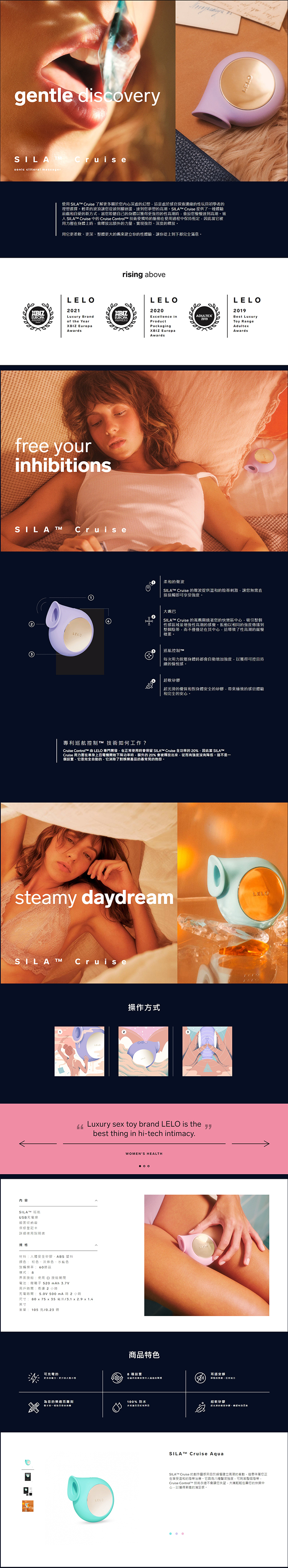 使用 SILA™ Cruise 了解更多關於您內心深處的幻想,這是處於感官探索邊緣的性玩具初學者的理想選擇。輕柔的波浪讓您從頭到腳迴盪,達到您夢想的高潮。SILA™ Cruise 提供了一種體驗前戲和自愛的新方式,當您聆聽自己的身體以獲得更強烈的性高潮時,會逗您慢慢達到高潮。嵌入 SILA™ Cruise 中的 Cruise Control™ 技術使獨特的脈動在使用過程中保持恆定,因此當它被用力壓在身體上時,會釋放出額外的力量,實現強烈、深度的釋放。