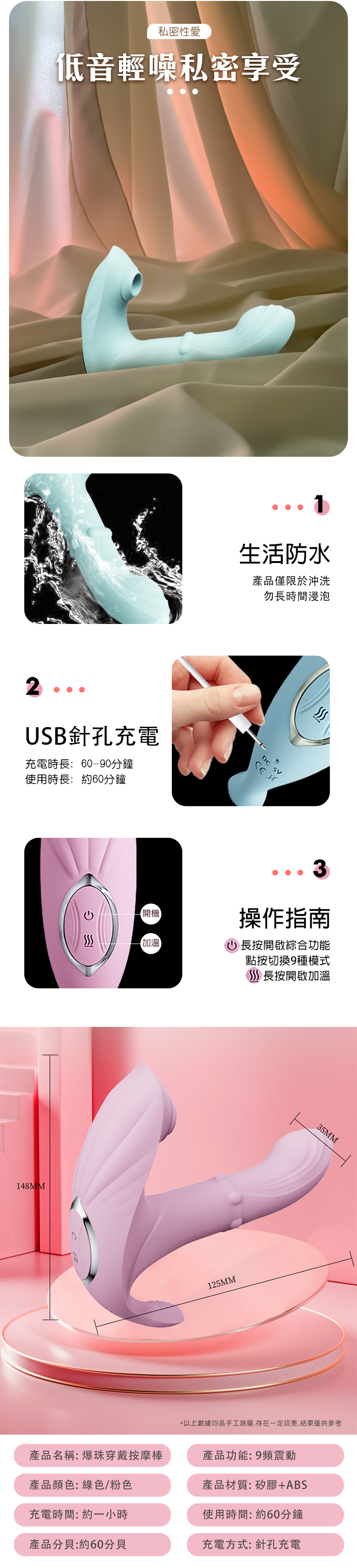 功能頻率:9頻(滾珠伸縮扣動加温吸吮)